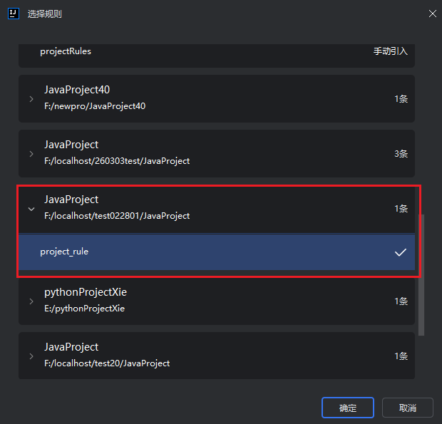 说明:当前只显示“项目规则”,不显示全局规则。若当前项目规则名称已存在,则确定后规则名称后面会拼接随机数,以保证规则名称唯一。